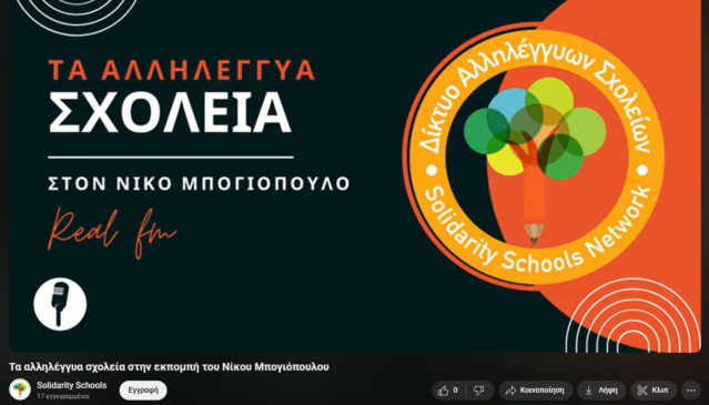 Ραδιοφωνική συνέντευξη στις 10/4/2024 στον Real fm και την εκπομπή του Νίκου Μπογιόπουλου με τον Χρήστο Κορολή από το Αλληλέγγυο Σχολείο Μεσοποταμίας. Συζητάμε για τα Αλληλέγγυα Σχολεία και την ημερίδα μας που θα πραγματοποιηθεί στις 20 Απριλίου με κεντρικό σύνθημα «Παιδεία χωρίς προνόμια, Μάθηση χωρίς διακρίσεις» στο Πολιτιστικό Κέντρο Δήμου Μοσχάτου-Ταύρου (Σολωμού 30, Μοσχάτο).