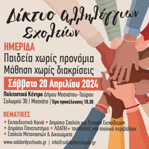 Το Δίκτυο Αλληλέγγυων Σχολείων – Solidarity Schools διοργανώνει το Σάββατο 20 Απριλίου 2024 ημερίδα με κεντρικό σύνθημα «Παιδεία χωρίς προνόμια, Μάθηση χωρίς διακρίσεις» στο Πολιτιστικό Κέντρο Δήμου Μοσχάτου-Ταύρου (Σολωμού 30, Μοσχάτο).